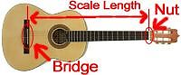 Общая длина гитары является хорошим показателем того, правильный ли это размер для ученика. Единственный способ узнать истинный размер гитары - это измерить ее «масштабную длину». Длина шкалы гитары - это длина от «моста» гитары до «гайки» гитары. Смотрите пример ниже
